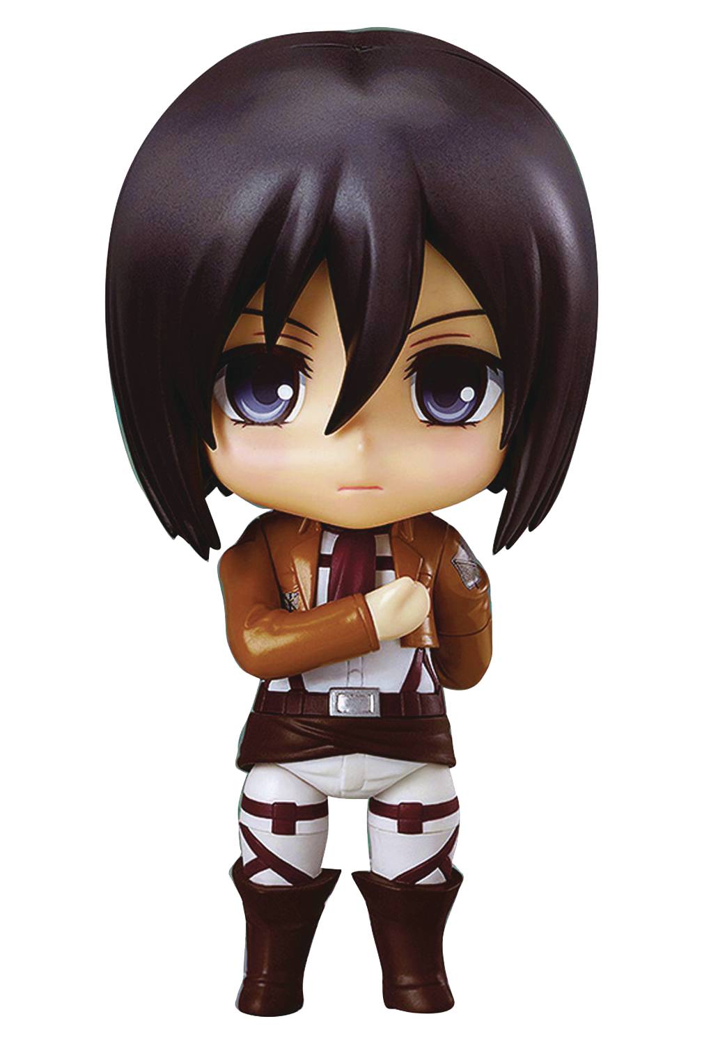 From Good Smile Company. From the anime series Attack on Titan comes a Nendoroid of Mikasa Ackerman! She comes with three expressions including her standard expression, a shouting expression and a stunned expression. The Nendoroid also includes her Vertical Maneuvering Equipment and dual blades, as well as effect parts to display her soaring through the air with the equipment. You can even pose her as if she were striking down into a Titan's neck by making use of the included blood effect parts which attach to her blades. The scarf that Eren gave her is also included to create even more scenes from the series. Stands roughly 4" tall.